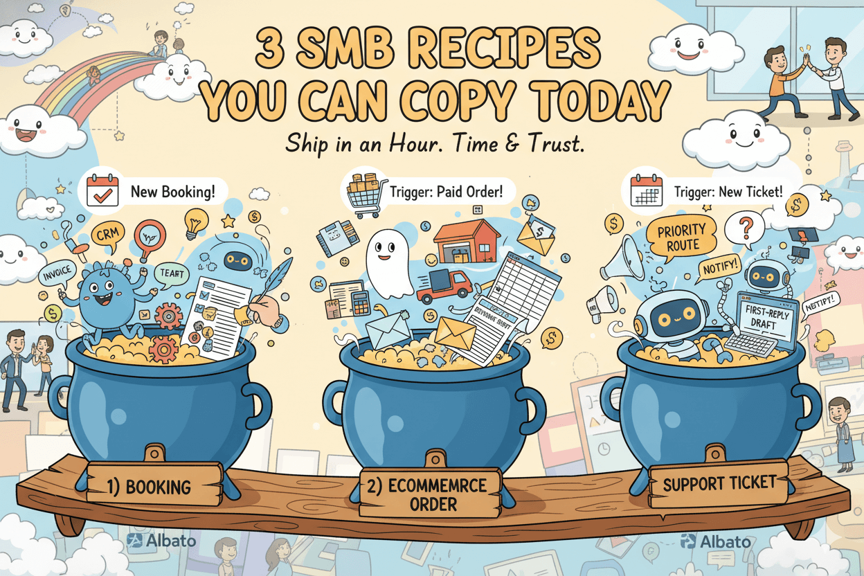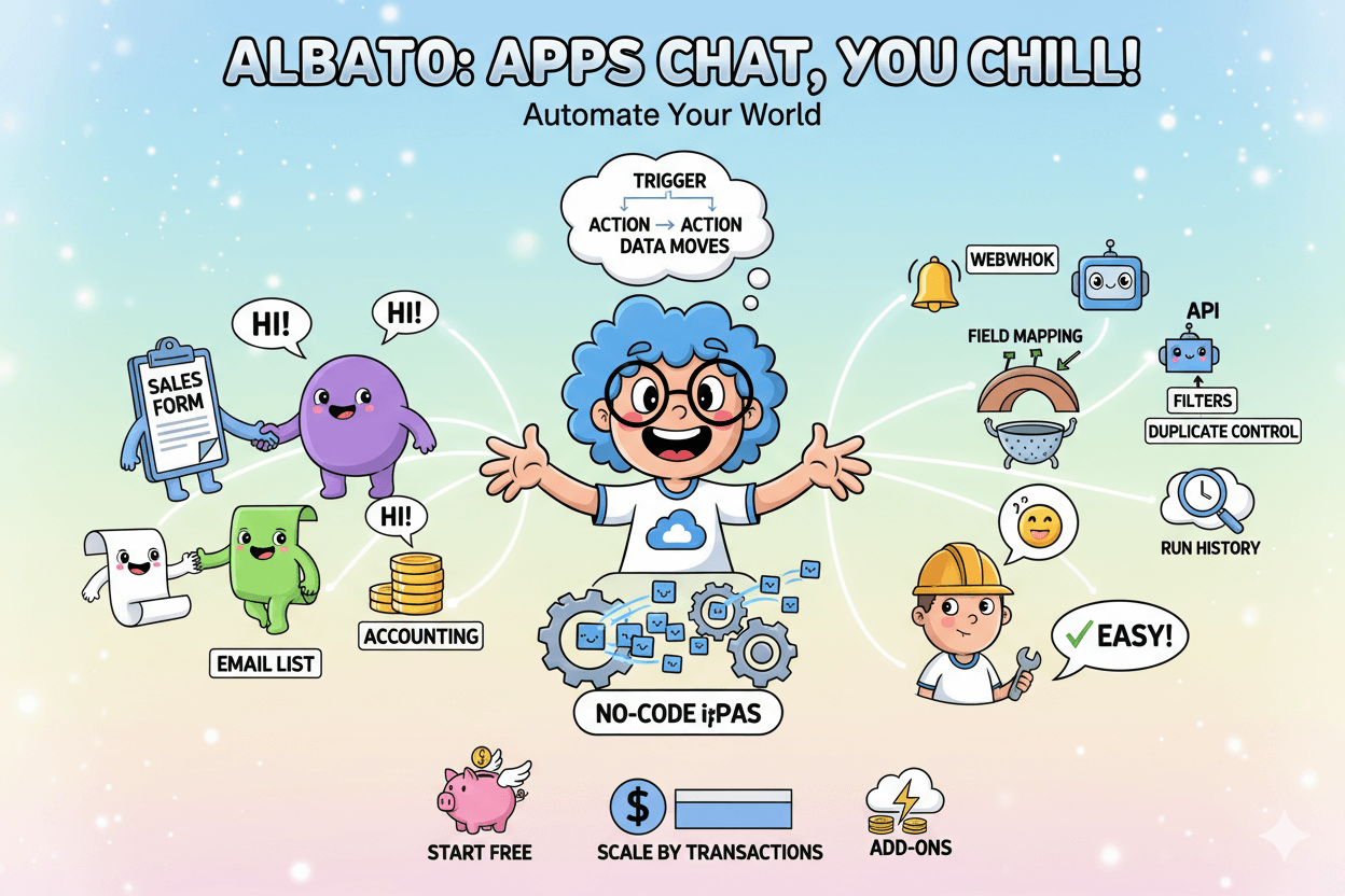 Most owners lose hours to copying data between forms, inboxes, and spreadsheets. Your first Albato automation gives that time back in a single pass: a form fires, a lead lands in your CRM, a sheet logs the record, and a confirmation goes out—without code.