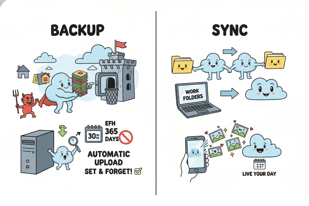 Sync is for two-way mirroring between a local folder and a chosen cloud folder. Use Backup for safety, Sync for working sets you want mirrored.