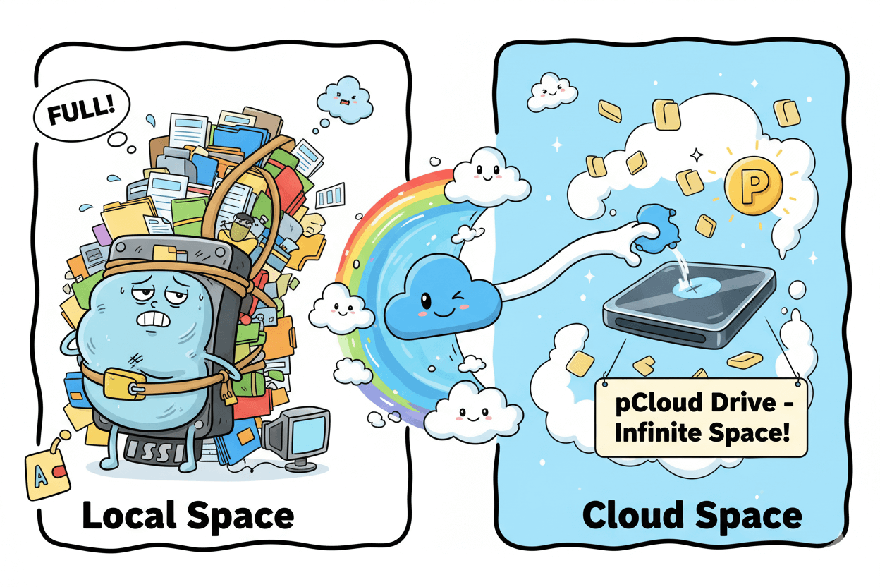 pCloud Drive behaves like another volume in Finder or File Explorer. Drag files into it to store them online and access them from any device. Because items are cloud-resident by default, you expand available space without moving to a larger disk.