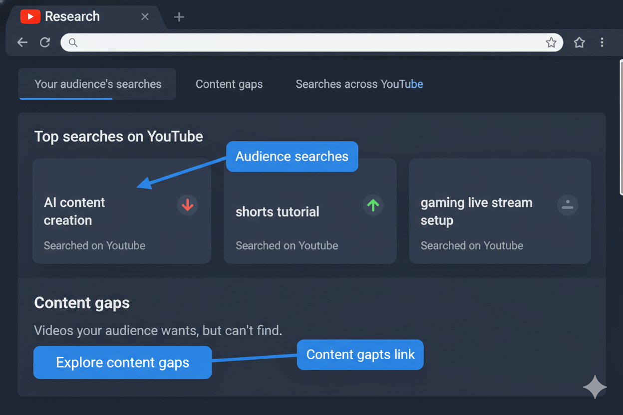 Here you’ll see what your audience—and viewers across YouTube—are actually typing, plus where content gaps exist that you can fill today.