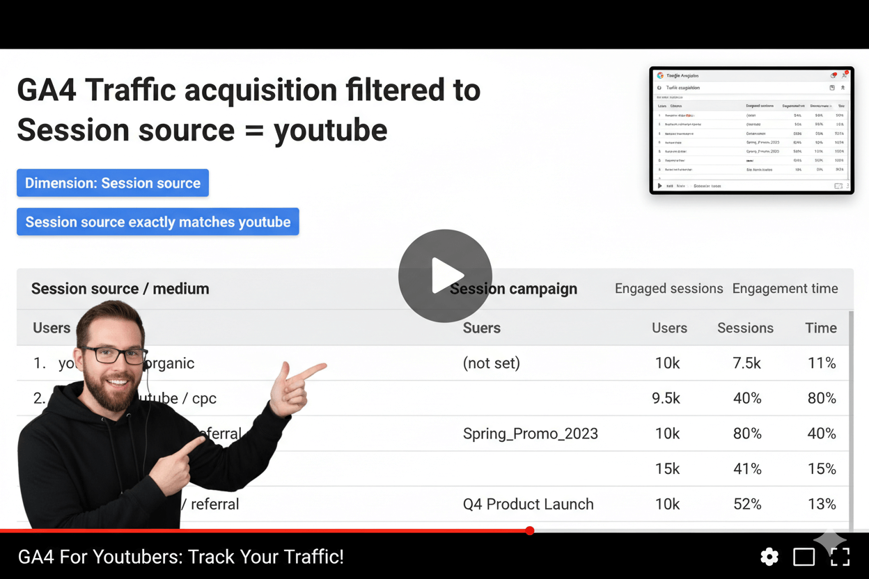 utm_source=youtube&utm_medium=video&utm_campaign={video-keyword}) so reports align. Track sessions and conversions in GA4 → Reports → Acquisition → Traffic acquisition.