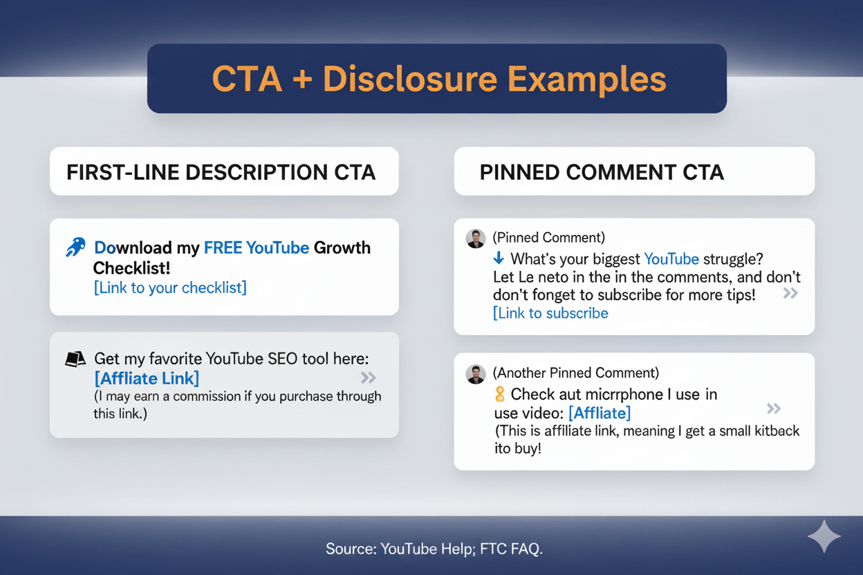 Place tagged URLs where clicks happen: description line one and a pinned comment in long-form, then repeat the reason to click. Add a short, plain disclosure near each affiliate link to stay compliant.
